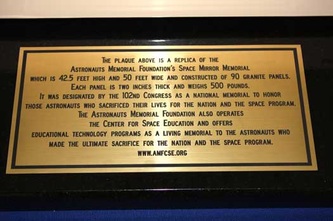 AMF has built replicas of the Space Mirror Memorial that have been placed in air and space museums and/or space centers. The replicas are made of granite sitting on a granite base with a steel backing. The size of each replica is approximately 19.5” tall, 20.5” deep and 25.5” wide.